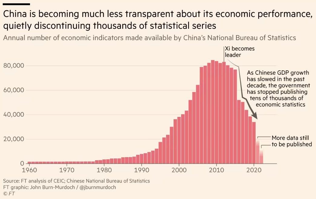 While some reacted with surprise, this is actually part of a wider trend in China over the last few years. John Burn-Murdoch of the FT has a good summary and a handy graph showing the disappearance of official statistics published by China. You should read it if you want the views of someone smarter than me discussing these things. This would be hard to deal with for investors in and of itself, but it’s coupled with other restrictions in the ability to get company information from China, or even conduct due diligence on possible investments.